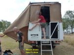 John's visitor Mezzie arrived today with her impressive slide-on camper. The afternoon's entertainment came in the form of Mezzie and some willing helpers setting up her awning and annex, which was finally achieved after several attempts. John gallantly surrendered some of his annex space so that Mezzie's annex could be secured.