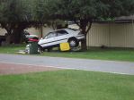 A neighbour told me today that the car had been stolen, being chased by police and turned down that street to escape, trouble is the street is blocked off by bollards at one end, so tried the ram the bollards and when that didn't work tried to back up to drive out of the street again and ran over the bins and up the tree.    Not sure if they caught them or not.