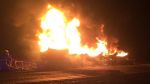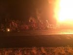 Two fuel tank containing crude oil that were being towed rolled and caught fire, blocking the highway.