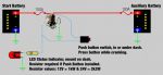 But instead of connecting the NEG terminals to ground, use 6B&S (13.5mm˛) twin to connect the batteries, and connect the red as shown and connect the black wire to the NEG battery terminals at each end. If you want to use the jump start function, you'll have to use heavier cable such as 2B&S (32.5mm˛) and connect the push button momentary switch as shown. The LED and resistor aren't required to use this function, they serve as an indicator in the cab. Where the fuses are, use 60A manual reset Circuit Breakers (100A minimum if using the jump start function).