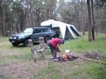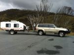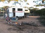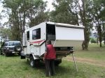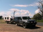 In 2008 we moved on from our Kimberley Kamper Trailer to a Kimberley Karavan. Our first camp in our new home on wheels was at the nice freebie on the bushy common in the NSW town of Broke - mainly because we felt that it reflected our financial status after the big purchase. We certainly enjoy the increased comfort provided indoors by having hot & cold running water, toilet, shower, airconditioning, diesel heating, TV (hardly EVER watch it), diesel cook top and microwave (which we usually store our medication in!). We appreciate the ability to camp anywhere almost indefinitly given the onboard solar panels, generator backup and facility for pumping water into the second tank from any source (although we have managed so far to only use good quality water in both tanks).We also like the option of hooking up the external shower nozzle so we can appreciate our surroundings as we bathe. HOWEVER, our preference is still to spend most of our time outside, under the awning, or tellling tall tales, sipping the odd cold wine/beer beside the camp fire preferably at some pictureseque, remote, awesome part of our beautiful country. When fully laden with fuel, water, gear etc the KK weighs about 1 ton. We towed her in the beginning with our dear old Nissan Patrol, called Betsy, who had given us incredibly faithful service towing our old Kamper all over Australia. After a couple more years, we decided to put Betsy out to pasture, so to speak, and upgraded to our new Nissan Patrol, aka 'Linus' (so named because they were the shares my husband had to sell to pay for her).