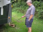 Soft cage on back seat was mostly a hot hit....after a few initial grumbles. the lead was ok....but we got out of sight on one occasion ....and the black one went ballistic...until I managed to scoop him up and cuddle him. So it seems that if they are both within sight and a short distance from either truck or caravan ....they're OK. They both know that either place is a safe haven.