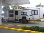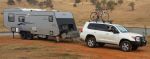 We bought our caravan a year ago when it was just a year old. It is a robust comfortable 25 foot off-road van custom-built by Designer Vans, and whilst we're both a couple of years off retirement we are currently doing plenty of short trips in it, sometimes with the whole family (five of us plus our Aussie terrier "Ruby"), just getting the feel of it and tinkering with its setup getting it ready for multi round Australia trips and gaining experience and confidence getting the rig around and setting up at camp.