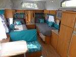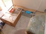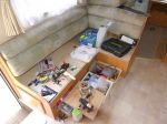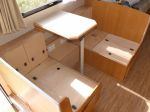 Wasn't too much problem, John just undid the long seat from the wall, cut the aluminium frame shorter, to allow better passage past the angled shower & also to match the finished size of the double fold table & then screwed it down using right angle brackets. (not the flimsy plastic blocks Jayco had).
