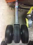 Basically took a 250 mm dia Jockey wheel (hard rubber) and added two outrigger wheels (260 mm dia Softer but NOT inflatable) $35 ea from Bunnings with a new 5/8th Bolt through the whole lot.