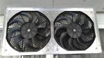 The pic below shows the original fans, as you can see there are several areas not serviced by the fans and the bracket in-between blocks a good portion of the radiator. Additionally the small fans that are more motor area than fan area. Before removing the old fans I tested them putting a piece of paper on the front of the radiator. The paper would hold anywhere the fan blades were directly under. So as you can see there's lots of core area that totally relies on airflow coming through when moving.