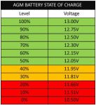 I agree with the discussion so far. Usefull ideas to guide you. I wanted to add that the voltage you measure as the battery is being used will not be the voltage shown in that table ! That table is the resting voltage but as you use power the voltage is pulled down lower than that table. It depends on how much current you draw out of the battery so you should be aware of that. Using a high current, say for example for an inverter, will pull the voltage down a few volts perhaps. When you stop using the power the voltage comes back up to the resting figure eventually.