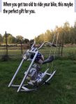 Hey G, I reckon put 4 wheels on it and a red flag on top of that back rest and it would make a good one of those scooter things some of us older folk get around on.
