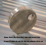50mm or 2" in diameter, 10mm or 3/8' thick, hole is also 10mm or 3/8". There is a wear mark around the hole, maybe 1/4 of a mm. There is a set of six. Originally from Stanley Tas, Dad was a boat owner/fisherman( now deceased so cant ask him). Would have to be 60 years old at least. Solid Brass, this one polished by me.