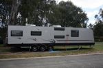 The van pictured above reminds me of a similar one I parked near at Coober Pedy, the rear opened to form a verandah and there were four bunks behind and obviously an ensuite next and way down the front a double bed. Lots of children. Another had a SWB Land Cruiser (must have been modified) used as a prime mover with a similarly long van behind on a 5th wheel setup, parked at Longreach.