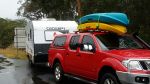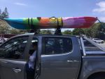 I placed the roof racks on car as wide apart as I could get them on our dual cab ute, next the kayaks, 2 straps to finish off. Headed down the road, slippery things moved about a bit because the racks are not far enough apart.