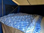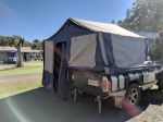 The camper is a "Desert Edge camper trailer" made by Telwater. It is incredibly easy to tow as it is very light and has the Alko tortion suspension system. It comes with an annexe, but we usually used a much larger tarp for multi-night stays. You don't need a "big" 4wd to tow this camper, it weighs 580kg unladen - most campers weigh closer to a tonne. I towed it with a Nissan Pathfinder (R51) and it was barely there. It is a dream to tow on sand! It is ideal for a couple with young kids as is. It has a 9ft tent, but I see you can buy new tents pretty easily these days and could swap it out easily, most of the value is in the chassis. This trailer has lockable storage on the front and sides.