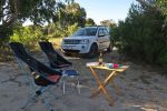 Since this photo we have bought 2 bases for sitting the chair on sand & headrest air cushions which work well, you can put a towel in the chair's carry bag which is designed to be a head cushion, either way it's nice to have. We sometimes put a foam mat on the seat for warmth. In this photo is the Thermarest cusion, but we actually prefer a bit of foam, Macpac sleeping mat cut to size.