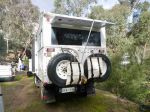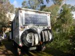 Then when we were isolating at our son's Bush block among the trees there wasn't much solar to be had so I bought 2 x 300 watts to ground deploy which helped a bit. Trouble is where to carry them when on the road. Ended up strapping them to the side of the bus and by parking the right direction, I can hook them up and harvest nearly as much per square metre over the whole day as the ones on the roof. Doesn't look so pretty but neither does the rest of the rig