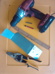 Picture 1 - Bracket and tools to make it. 365 x 80mm, 45° bend at 95mm, narrowed end 50mm with 90° bend at 105mm. YMMV