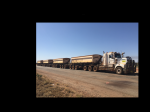These 60 metre long trucks are known as 'Super quads', tri-drive with 3 axle semi-trailer towing 3 x 7 axle Dog trailers.